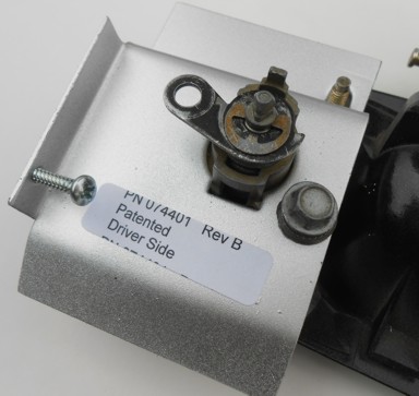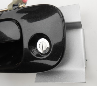 < The photo to the left shows a Jimmi' Jammer® plate mounted to the backside of the door handle.