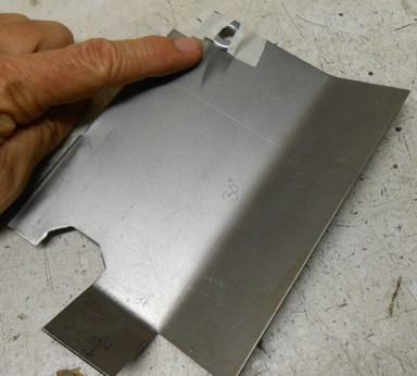 Photo 13 Before bolting the plate in place, check that your door handle doesn't have the strap across the back as described above. If it does, trim out the center of the strap to give the plate a place to rest against the handle. This photo shows the plate with two of the flat washers taped in place to ease installation. Use two washers between the plate and the door handle mounting post to properly space the plate from the handle.