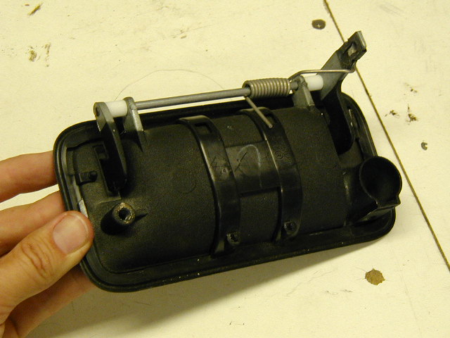 Photo 12 DO NOT REMOVE THE HANDLE! This photo is for demonstration only. This photo shows one possible problem in the installation process that varies by model year. Later models and replacement handles often have this thick rubber strap across the back of the handle. It is only needed during the molding process of the gasket. Note that the gasket is held in place using two pins near the bottom of the handle. This strap may cause interference by keeping the plate too far from the handle when installed. You can cut the strap so that the middle section comes out, eliminating the problem. The gasket will not be affected. Use a sharp knife or box cutter to cut the rubber at the narrowest points. Some straps will consist of a single piece across the back. This type is usually thick also and needs to be cut as well. It is usually not necessary to remove the handle to do this. |