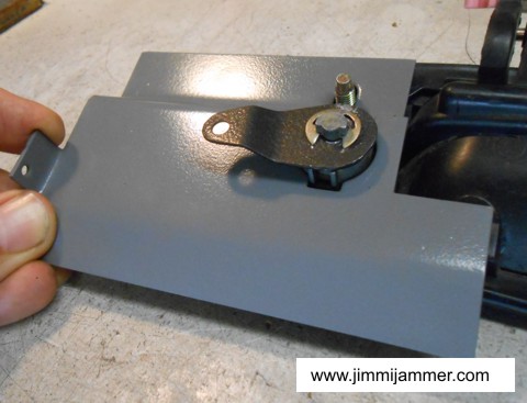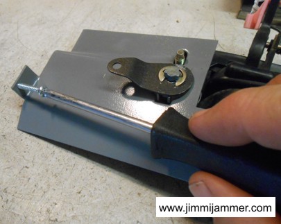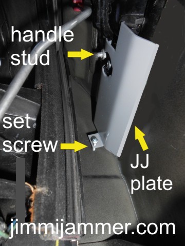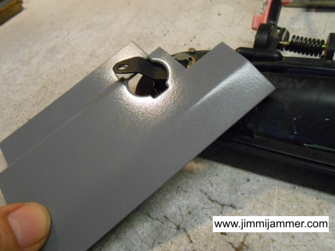 Photo 15 Before putting the plate into the door, make sure the set screw is started into the tab on the end of the Jimmi Jammer plate. (See photo 17.) Use the door key to turn the lock so the lock pawl is pointing downward. The lock rod will need to be disconnected, then threaded through the lock hole in the plate. The lock rod is not shown in this picture. Place the plate so the lock hole lays down on the lock holder. If you have difficulty with this step, it may be helpful to remove the handle mounting nut on the other end of the handle, and move the handle slightly out of the door metal. Place the plate in the approx mounting location and install the handle back in the door, putting the lock rod and lock pawl through the hole in the plate. |