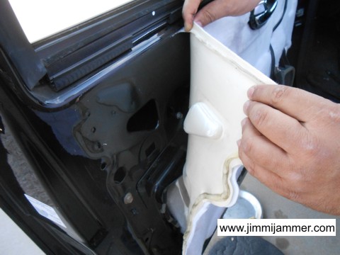 Photo 12 Peel back enough splash guard to allow access to inner door cavity. About half the splash guard will need to be pulled back. A piece of tape can be used to hold the splash guard away from the open half of the door. |