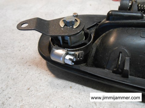 Photo 13 This fuzzy picture shows the backside of the door handle from above. Remove the nut from the handle stud above the lock cylinder. This vehicle was burglarized by the thief punching the lock into the door. Note the bottom of the lock cylinder holder is broken. In this case, we were able to re-use the handle by installing our PunchPlug product. The PunchPlug does away with the lock cylinder altogether. You then use your key fob remote to lock/unlock the door as usual, but the thieves can no longer punch the lock to gain access. Not comfortable removing the lock? Check out our LockCap product. |
