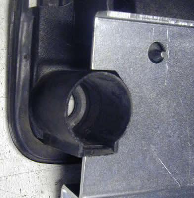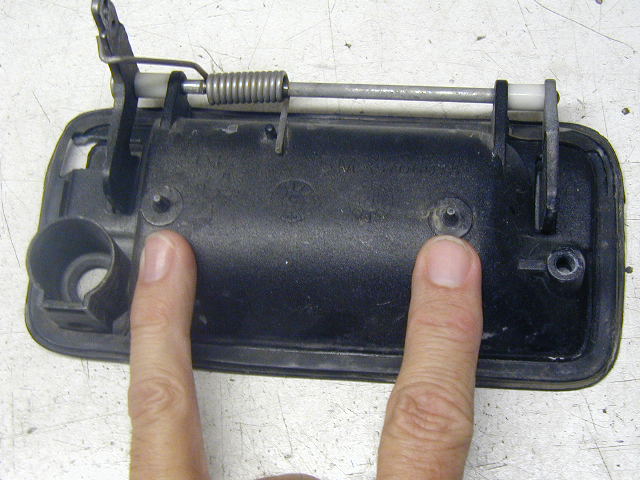 Photo 12 DO NOT REMOVE THE HANDLE! This photo is for demonstration only. This photo shows one possible problem in the installation process that varies by model year. Later models and replacement handles often have this thick rubber strap across the back of the handle. It is only needed during the molding process of the gasket. Note that the gasket is held in place using two pins near the bottom of the handle. This strap may cause interference by keeping the plate too far from the handle when installed. You can cut the strap so that the middle section comes out, eliminating the problem. The gasket will not be affected. Use a sharp knife or box cutter to cut the rubber at the narrowest points. Some straps will consist of a single piece across the back. This type is usually thick also and needs to be cut as well. It is usually not necessary to remove the handle to do this. |