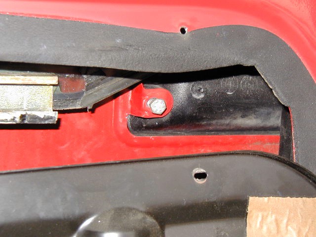 Photo 11 The door handle is held in using two bolts. This is the inside bolt. The other bolt is in the door jamb and is not used for this process. There is no need to remove the door handle, lock rods or lock pawl for this installation. Remove the handle bolt shown in the center of this picture. Note that the bottom edge of the window is positioned to allow access to the mounting bolt. |