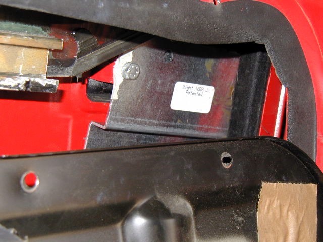 Photo 13 Before bolting the plate in place, check that your door handle doesn't have the strap across the back as described above. If it does, trim out the center of the strap to give the plate a place to rest against the handle. This photo shows the plate with two of the flat washers taped in place to ease installation. Use two washers between the plate and the door handle mounting post to properly space the plate from the handle.