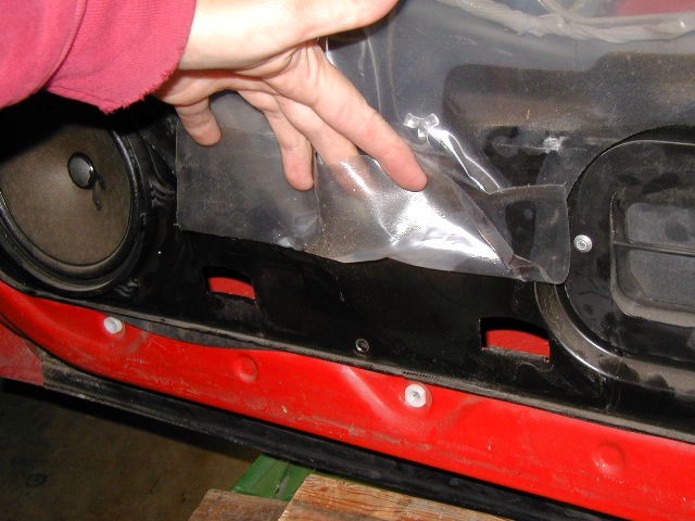 Photo 9 Note: Read this entire step before removing any screws front the metal panel. Behind the trim panel there is a secondary panel. This panel holds the insides of the door together. By following this tutorial, you will save a lot of install time. The metal panel is held in place using several sheet metal screws around the perimeter of the panel. Remove them and put them in a little pan or cup so they don't disappear. This photo shows two important places where the metal panel is bent inward to hook over the door metal. Once all the screws are removed, the weight of the door components and window will be on these two hooks. Make sure they are properly seated before removing the last of the screws. When all screws are out, place the milk crate back under the door, so that you can lower the panel about 4 inches or so and rest it on the crate. This eliminates the need to further disassemble the door components to install the plate.