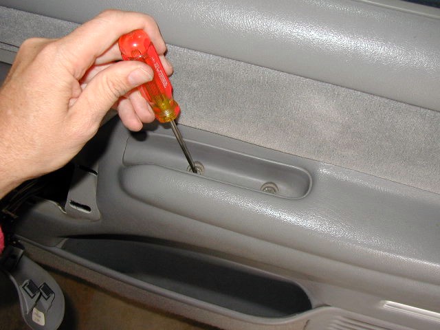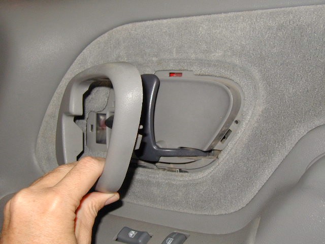 Photo 2 It is sometimes easier to remove the panel when the window is down, so make sure it is down at this point. Remove the inside door handle shroud. It snaps into the door panel in a couple of locations. Work carefully to pry the shroud away from the panel. You can see two of the snap locations on the right end of the shroud and along the top edge. Pry these out first, then remove the shroud.