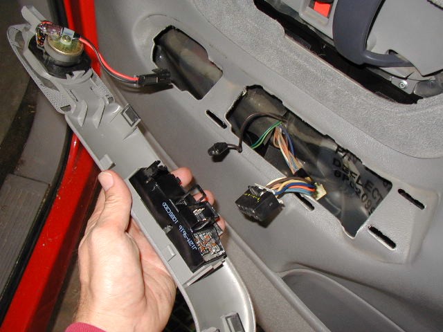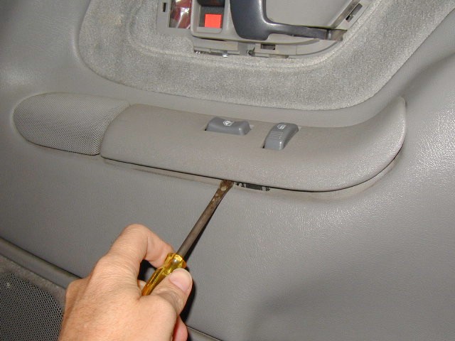 Photo 3 Next, remove the electric switch panel by carefully prying in an upward motion. The module snaps onto the panel in several location so just work your way around the module until it pops up. Don't disconnect the wires yet, you will need to roll the window up when the panel is off. |