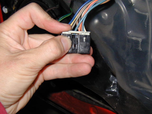 Photo 6 Once the panel is released from the door, roll the window up. Leave the window down about 1/2 inch (no more,) to allow easier movement of the metal panel. (See photos 9, 10 and 15.) Now release the speaker wire connector and the switch module connectors. Be careful since most have a locking tab on the connectors. See the next photo down for a close up of the locking tab. Before you can pull the panel away from the door, you need to disconnect the courtesy lamp behind the panel. Skip down two photos to see the lamp close up.