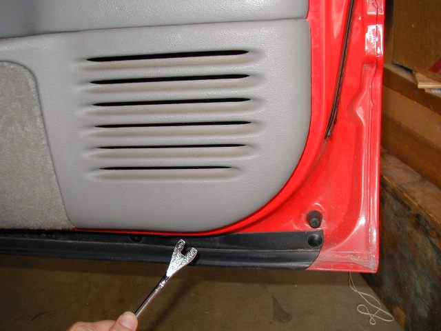 Photo 5 Now you are ready to start popping the clips holding the panel onto the door. Use the panel popper, (or large flat screwdriver with a small block of wood for leverage,) to unseat the clips one at a time until they are all loose. It is usually easiest to start along the bottom edge of the door. Pry the panel away from the door so you can see the clip locations. Put the tool on the clip head, against the door panel, and pry away from the door metal. If your block of wood is big enough, you should have enough angle to get the long clip out of its' holder. With practice, they will start to pop right out. Wedge the panel away from the door as you progress to keep the clips from pressing back into their holders as you work. |