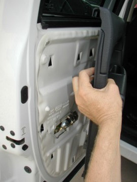 Photo 1 - If equipped with manual windows, remove the handle by releasing the c-clip behind the handle that holds it on the shaft. The window should be in the "UP" position for th entire installation. If you don't have the tool to remove the clip, use an old Tshirt or shop rag and work the edge of the rag down onto the open end of the clip. (You should be able to peek behind the handle and see the clip ends by pushing the panel inward.) Work the rag back and forth and the clip will usually release. The tool is available at many auto parts stores if you can't get the rag trick to work. Keep your hand or a rag around the handle base while trying to remove the clip. The clips tend to spring off and can go flying if not captured. Pull the handle straight off the shaft. Once off, it is a good idea to put the C-clip back in place on the handle. You can snap it all the way on at this time. |