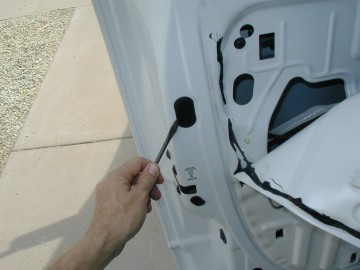 Photo 7 Remove the plastic plug in the door metal to allow access to the handle nut inside the door. You will need a long extension (about 6 inches) to reach the nut. An 8mm nut driver may be long enough also. |