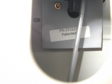 Photo 9 Bring the plate into the door. This photo shows the hole to the left that goes over the handle stud. The trick here is to get the plate up near the handle, then tilt the bottom edge toward you while reaching around to the outside handle and pulling it out a little. This opens up some room along the top of the handle so the little slot shown near the upper center of the plate here can hook over the handle post. See the next photo down. |