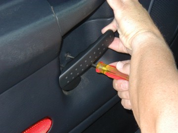 Photo 3 Remove screw behind the inside door handle. This is a good time to get a little tray or can to hold your screws so they don't get lost. |