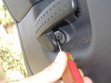Photo 4 Remove door handle by removing the bolt on the inside end of the handle. The screwdriver in this photo is pointing at the bolt to remove. Use a 10mm socket to remove this bolt. Note: Some vehicles may use a torx head bolt here. For these, it is a Torx T-40 bit. |