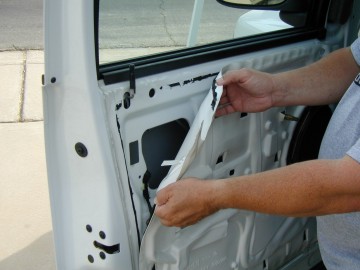 Photo 6 Gently peel the plastic splash guard away from the door. The black adhesive material can be peeled away from the door and re-stuck on the splash guard for reuse. Peel back far enough so you can get into the door through the access hole shown here at the upper left part of the door. (This photo is from a front door, but you get the idea, right?) |