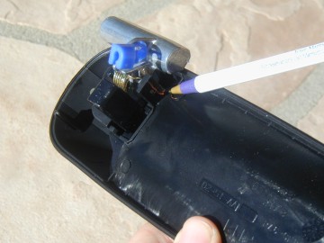 Photo 10 The handle is shown off the truck for clarity. You do not need to remove the handle! This is a driver side handle, the mounting stud is hidden behind the handle pull mechanism. The pen is pointing to the post that the plate should hook over. By tilting the plate so the bottom edge is slightly away from the door metal, and pulling on the handle from the outside, more room is available to slide the plate in over the post. Then drop the plate over the mounting stud and put the handle nut back on. Test the handle operation to make sure nothing catches. If there is interference, make sure the plate is hooked over the handle post where the pen is pointing here. The plate should be pulled down as far as possible on the stud. |