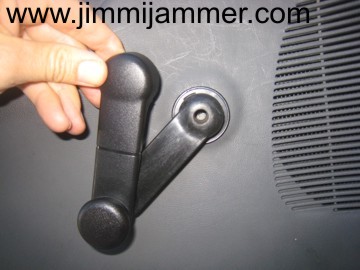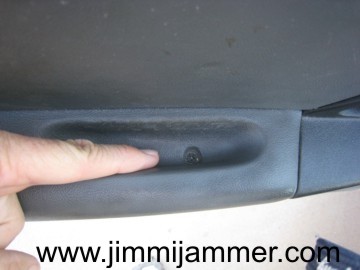 Photo 5 Note: Have window in "up" position before removing the handle or electric switch panel. To remove the manual window handle, start by using a flat blade screwdriver to pry the cover off the large end of the handle. Just the large end cover will come off the handle. The cover will then swivel at the smaller end. If you have the electric windows, the control panel should pry up and out of the door panel. Work carefully as some connections will be hot and could short to your tools. |