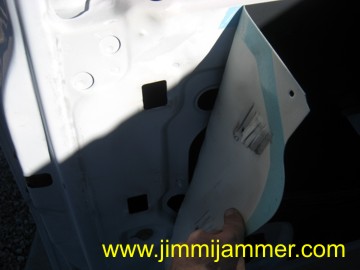 Photo 9 Start at the upper outside corner of the door and peel back splash guard enough to gain access to inner door components. |