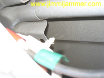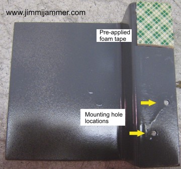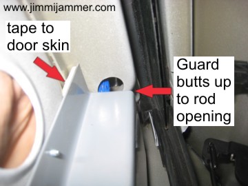 We are now ready to install the Lock Rod Guard plate. Photo 16 This photo shows a Lock Rod Guard in place inside the door cavity. The Lock Rod Guard prevents a screwdriver from entering through the handle opening and getting to the manual lock rod. Along the left edge of photo 16, you can see two screws holding the plate to the door skin. You will need to drill these holes in the door skin, then mark the Lock Rod Guard plate and drill corresponding holes in it. This operation is very easy. Photo 16a The Lock Rod Guard plate is furnished with a piece of double sided foam tape in one corner. This corner of the plate should butt up to the bottom side of the door sheet metal near where the lock rod comes through into the door cavity. This corner of the Lock Rod Guard can be seen in photo 16a. The tape is just to prevent the plate from rattling while you're driving.