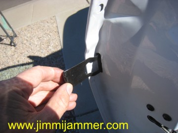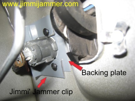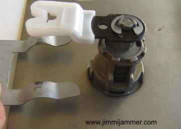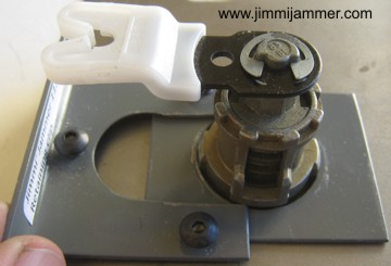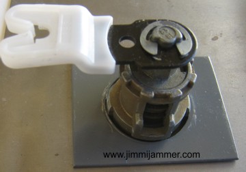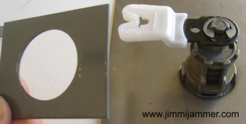With the snap clip removed, it is easy to move the lock so that the lock rod can be disconnected from the lock pawl. (No photo for this.) The lock pawl is the white plastic piece in these photos, the lock rod is not shown. Photos 13 & 13a With the lock rod removed, and the lock back in place, slip the Jimmi' Jammer® backing plate over the lock as shown in photos 13 and 13a. |