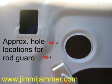 Photo 18 After you've marked the holes on the plate, remove the plate from the door. Use a 3/16" drill and make the holes in the marked locations. With both holes drilled, check alignment of Lock Rod Guard holes with your newly drilled holes in the door skin. If everything aligns, peel the backing from the tape on the Lock Rod Guard plate, re-align in door and press tape firmly to door panel metal. Put in both provided screws and nuts. Check operation of door lock and that everything is snug. |