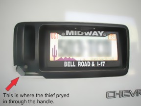 The photo to the right is from one of our customers. This van was burglarized and several thousand dollars worth of tools were taken. The thief used a piece of old shelf metal that was laying in the parking lot to pry the handle corner and break it off. Once that piece came off, he was able to use his finger or screwdriver or other tool to reach in and move the lock rods. A Jimmi' Jammer® would have stopped this burglary. Now, on to the installation for your rear door.  |