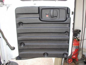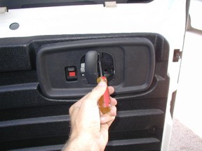 This would be a good time to get a little tray to hold your screws and other hardware so you don't lose them. Photo 1 The first photo shows a view of the REAR CARGO door. Some vehicles have the door panel trim all the way around the window, others the door panel stops at the window bottom. Either way, the removal steps are similar. Start by removing the small plastic cover behind the handle in this photo. Use a screwdriver and gently pry the cover off the door trim. It comes off easily as it is a snap in cover.