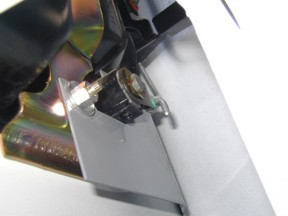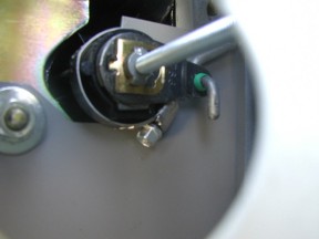 Photo 8 Use the circular clamp provided with the kit. Open the clamp so that the ends separate. Now you can get the clamp around the lock cylinder plastic holder. Put the clamp on as shown here. Make sure the head is accessible for tightening. Position the clamp and tighten it snugly. Make sure the plate is on so that the far edge shown here is BEHIND the lock rod. Now use your door key to test that the lock still functions properly.  |