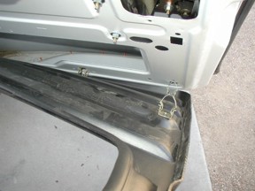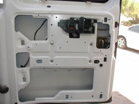 Photo 5 Looking up and in the door cavity. The lock rod goes upward to the latch on this door which is different than on the other doors on the van. The Jimmi' Jammer® plate will wrap around the lock holder and provide a metal barrier to the lock rod.  |