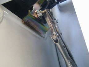 Photo 6 On these vans, the handle studs are threaded into the plastic handle. We use a vice grip on the end of the stud, (there are no threads here,) to hold the stud while the nut is loosened. Put the vice grip on the end of the stud, leaving room to get an open end wrench or adjustable wrench in to loosen the nut. Once the nut breaks loose, you can release the vice grip and remove the nut from the stud.  |