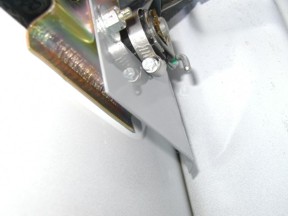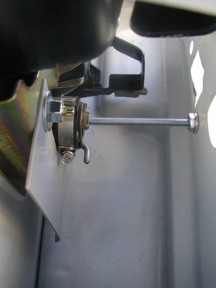 Photo 10 Photo 10 shows the lock stop screw already affixed to the door skin. Try to make the hole so the screw will be as straight as possible behind the lock cylinder. If alignment is correct, drill a 1/4 " hole on your mark. The provided washer goes against the inside of the door skin, then the lock washer and nut. This screw will prevent smashing the lock straight into the door. Note that the screw butts right up to the lock, but should not interfere with lock rotation. See the next photo.  |